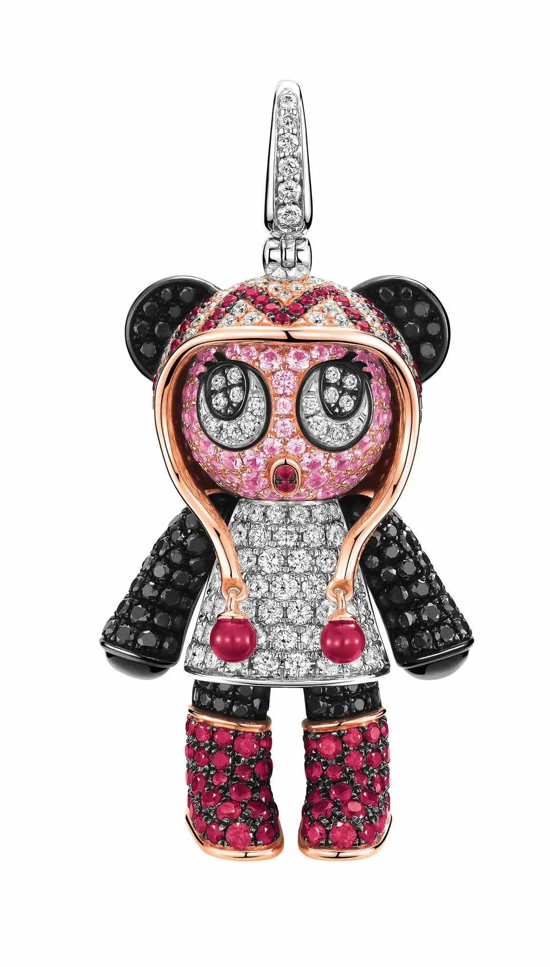 品牌代言人林允儿佩戴的Guimi Bo Bo吊坠,以18K玫瑰金、钻石及红宝石精心铸造而成,动感造型在精准比例把控下,塑造出前卫的气息,是件令人爱不释手且极具收藏价值的臻品。Guimi Bo Bo的头部和四肢均采用灵巧活动的设计,它所戴的帽子也镶有摆动的红玛瑙球。Guimi Bo Bo的面部表情则设计得更为精妙,既可以是英姿飒爽的帅气面孔,又可以摇身一变,成为粉面红唇的俏皮小妹,随心搭配彰显独特个性。
