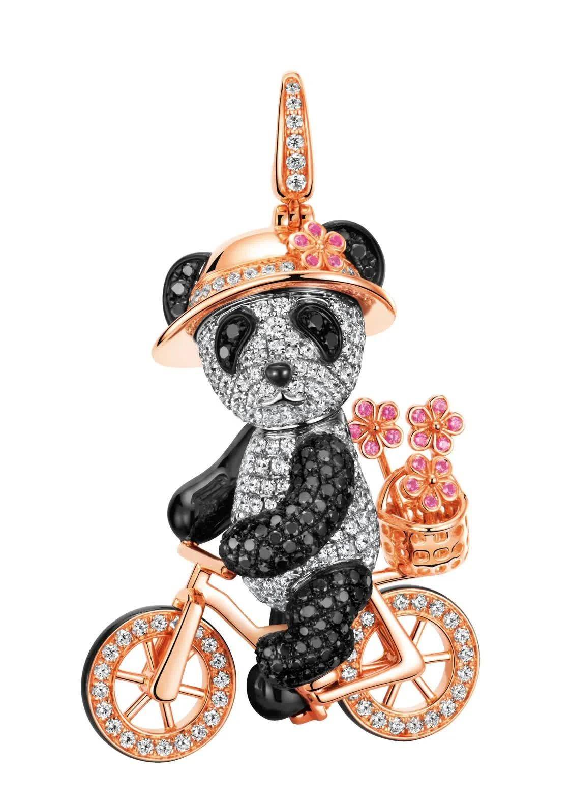 Qeelin Bo Bo Cote d'Azur吊坠由18K白金及玫瑰金制成,237颗白钻点缀熊身,147颗黑钻装点熊猫眼睛、耳朵和四肢。单车后座花篮里的花束,则以20颗粉红蓝宝石装饰,呈献出明艳悦动色彩。凭借精湛的铰接工艺,Bo Bo头部可以转动,精密细节把握奠定了Qeelin兼收并蓄的美学主张;单车的轮子也能滚动,巧妙结构形成起伏有致的韵律,洋溢浓郁浪漫的文艺气息,让光芒肆意流淌。